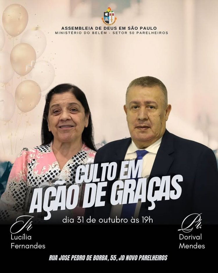 Queridos irmãos, com muita alegria convidamos todos para o culto em ação de graças pelo aniversário do nosso pastor setorial Dorival Mendes e da nossa querida irmã Lucília!